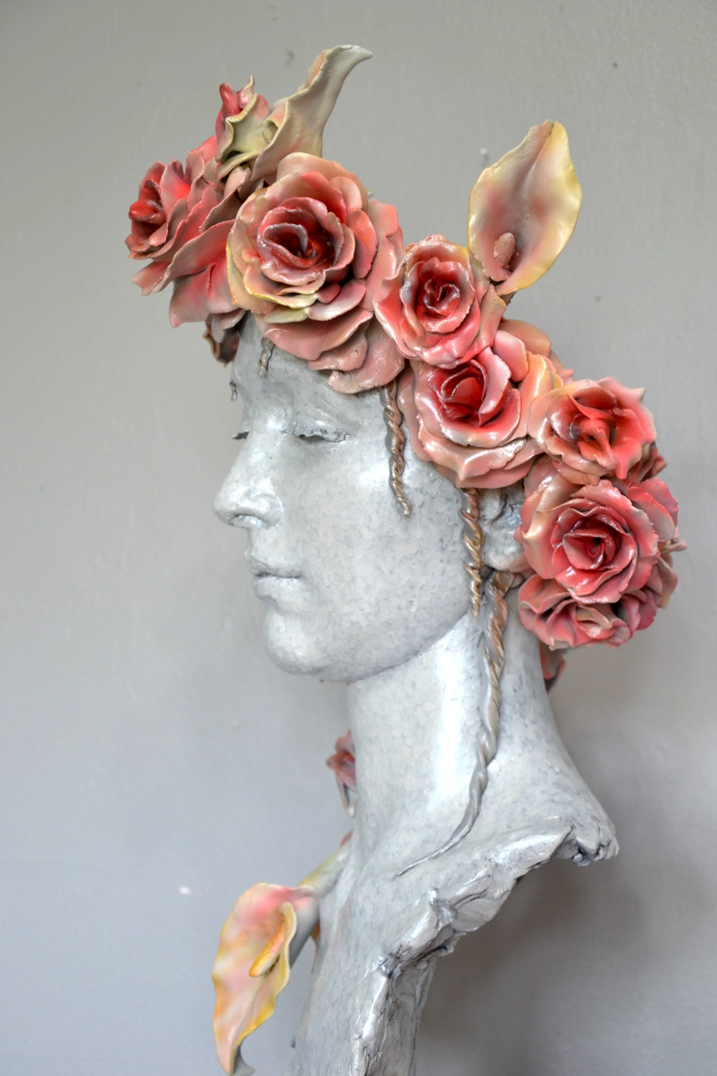 This sculpture is modeled with epoxy clay. The flowers for the decoration are modeled with epoxy clay one by one. The artwork is finished with acrylic paint and the shine is given by a clear. It has a multicolor LED light inside that represents the soul of the sculpture.
